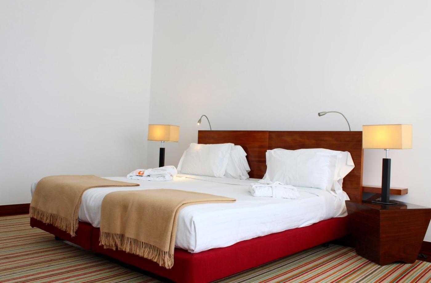 Quarto Duplo ou Twin Superior. Localizado na ala nova, este amplo quarto climatizado possui um design moderno e uma varanda com vistas para o campo alentejano. Cada um está equipado com uma televisão de ecrã plano, um cofre, um minibar, um telefone e uma casa de banho privativa com secador de cabelo. ;